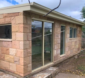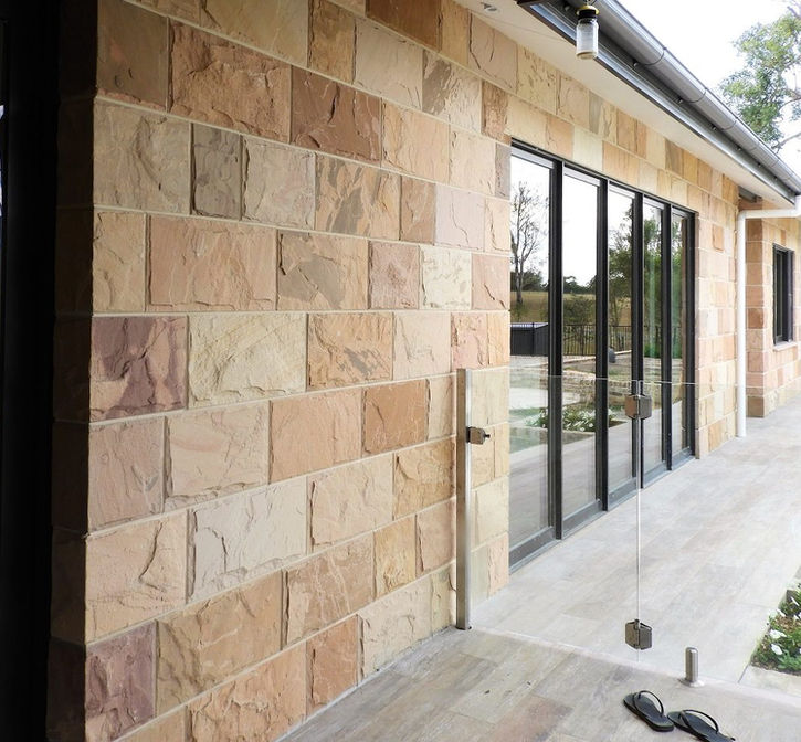 This natural sandstone features a split bolstered finish with warm beige tones and natural variation. The stone is supplied as individual pieces and is installed using conventional masonry fixing methods onto suitable substrates such as brick, block or concrete.